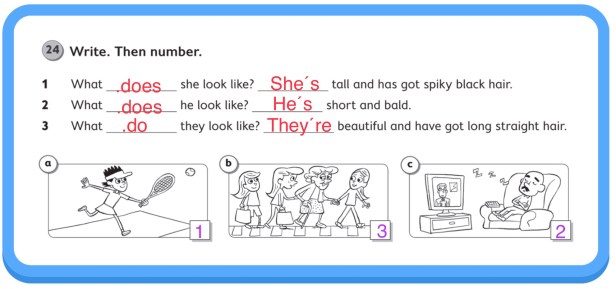 Completa las preguntas y las respuestas. Enumera las imágenes.