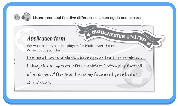 3. Listen, read and find five differences. Listen again and correct the text.